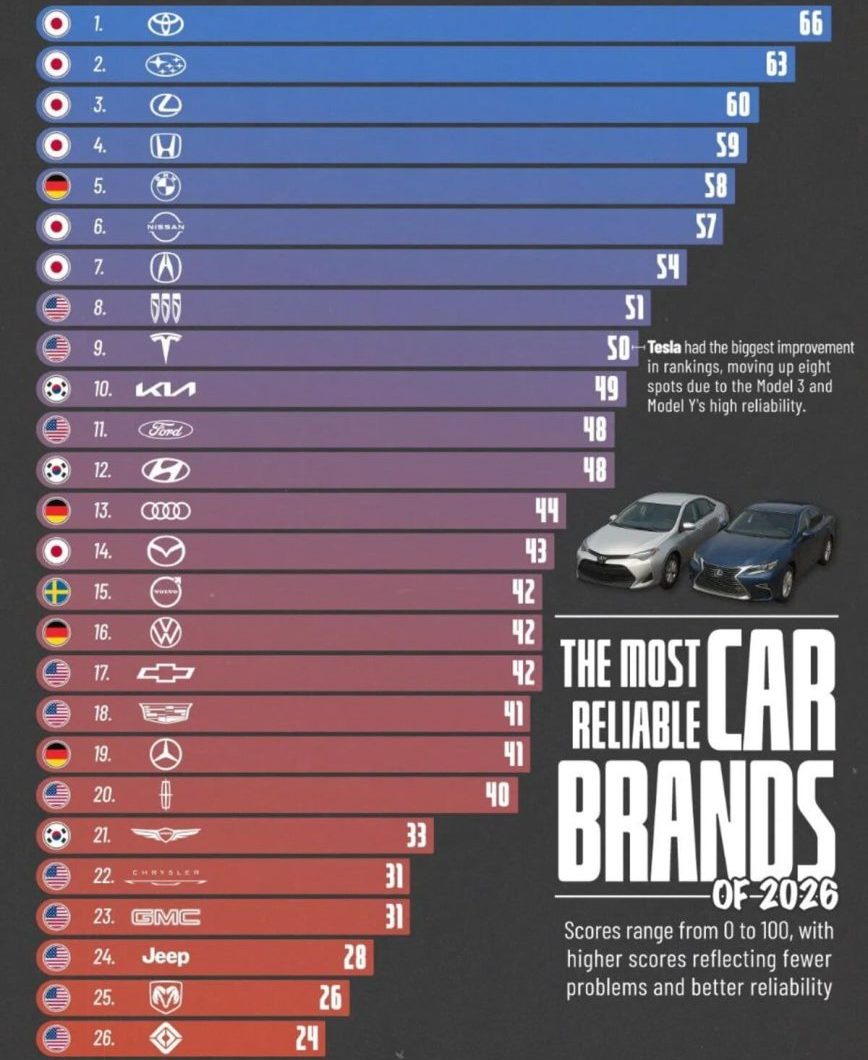 2026-жылдагы эң ишенимдүү автоунаа бренддеринин рейтингинде биринчи 7 орундун 6сын жапон машиналары ээледи. Рейтингдин башында Toyota турат, андан кийин Subaru жана Lexus орун алышкан.