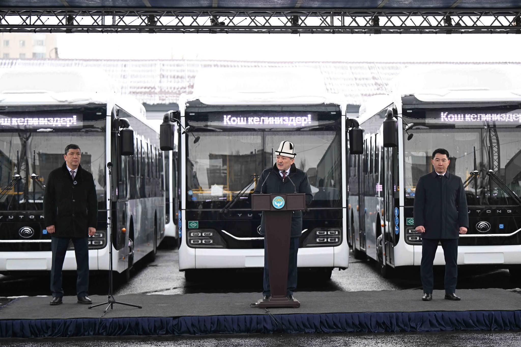 Министрлер кабинетинин төрагасы Адылбек Касымалиев Бишкек мэриясына 95 жаңы автобустун жана 42 даана атайын техниканын ачкычын тапшыруу аземине катышты.
