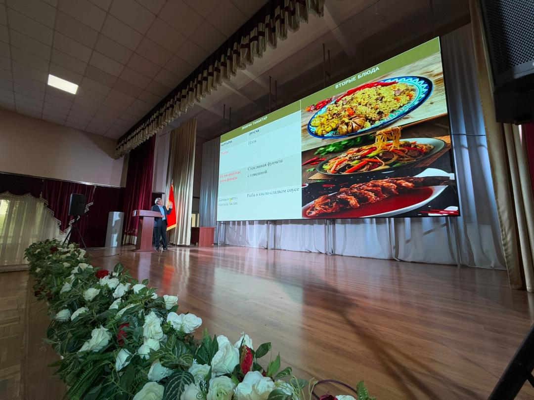 Ошондой эле Кыргыз энциклопедия жана терминология борборунун башчысы Темирбек Осмоналиев «Коомдук тамактануу жайларындагы аталыштарды бирдейлештирүү» темасында баяндама жасап, терминологиялык тактык жана тил нормаларын сактоонун зарылдыгын белгиледи.