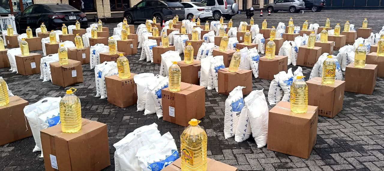 Ар бир үй-бүлөгө ун, макарон азыктары, күрүч, кант, өсүмдүк майы, кургатылган жемиштер, чай, томат, курма жана туз камтылган азык-түлүк топтому берилди.