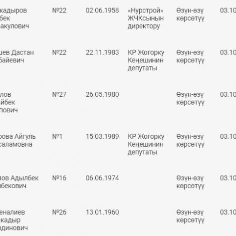 Алардын катарында Бишкектин экс-мэри Эмилбек Абдыкадыров, мурдагы саласаттыкты сактоо министри Алымкадыр Бейшеналиев, 7-чакырылыштын депутаттары Дастан Бекешев менен Айгүл Айдарова бар.