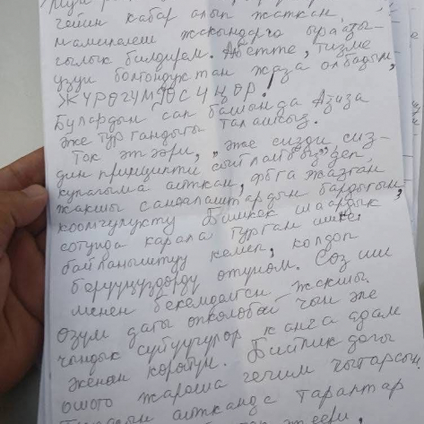 СИЗОдон чыксам элдин бетин түз карайм, бетим күйгөн жок, кылмыш кылган эмесмин. Айрымдар, карайбы? Аны жараткандын каалоосу билет чыгаар. Ар бириңиздерге салам жолдоп, үмүт кылган Канышай Мамыркулова", - деп жазылган катта.