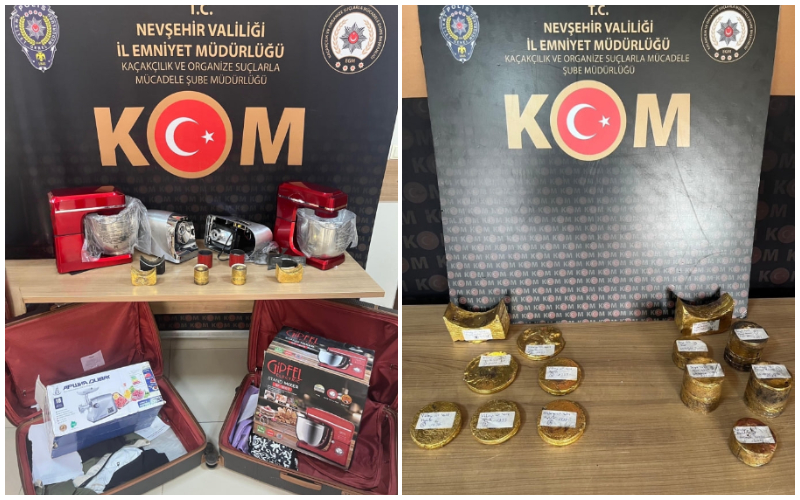 Контрабандага каршы күрөшүү жана полиция кызматкерлери Стамбул аркылуу чет өлкөдөн Каппадокия аэропортуна келген адамдардын тобун аңдып, алардын чемодандарындагы фарш жана камыр аралаштыргычтарды текшерип жатып, ичинде эритилген бөлүктөрү менен жашырылган алтынды табышкан.