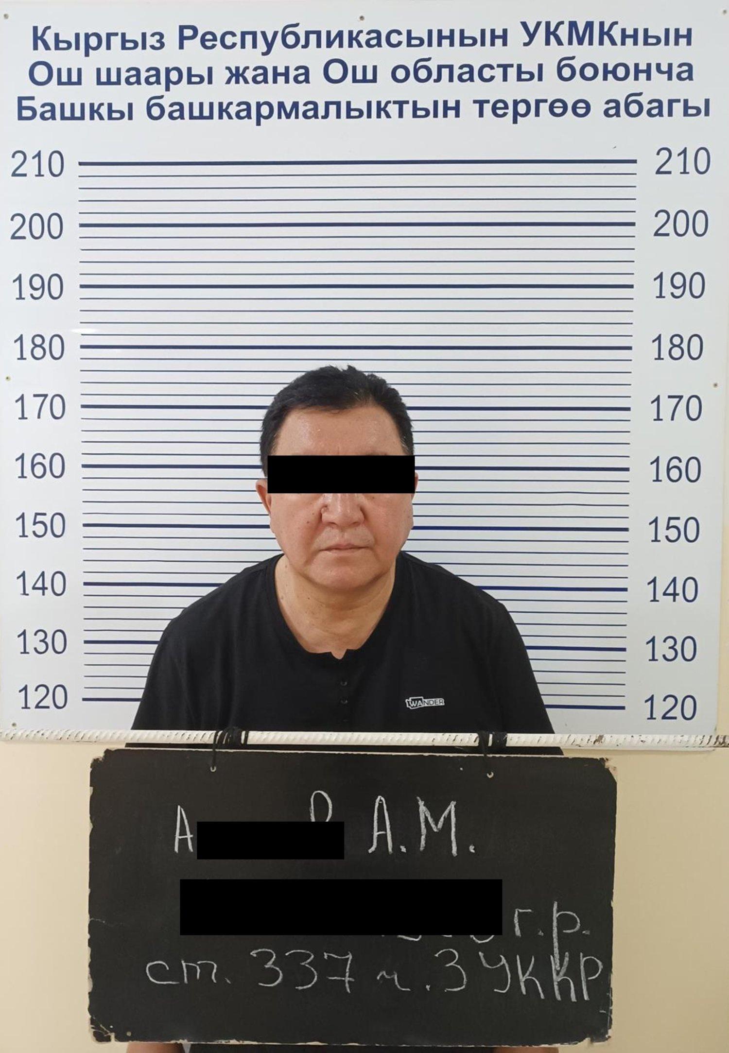 Жүргүзүлгөн иликтөө иш-чараларынын негизинде Кара-Суу райондук МСК башкармалыгынын башчысынын орун басары «А.А.М.» КР КЖК 337-беренесинин 3-бөлүгүндө каралган кылмыштын белгилери боюнча шектүү катары айыпталды. 2025-жылдын 22-июль күнү Ош шаардык соту тарабынан «А.А.М.» КР УКМКнын Ош шаары жана Ош облусу боюнча башкы башкармалыгынын тергөө абагына камакка алуу түрүндөгү баш коргоо чарасы тандалды.