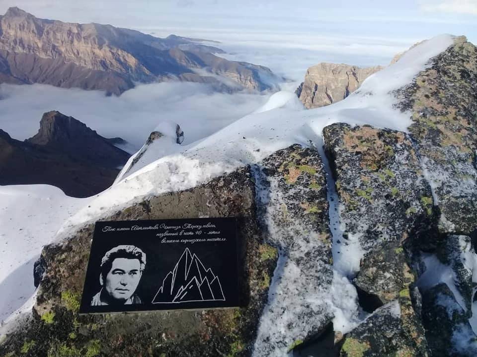 Чыңгыз Айтматовдун аты берилген чокуга Кыргызстандын Мамлекеттик желеги, Айтматов пигинин табличкасы кыргыз альпинисттери тарабынан жеткирилгенин жазды жазуучу Султан Раев фейсбуктагы баракчасына.