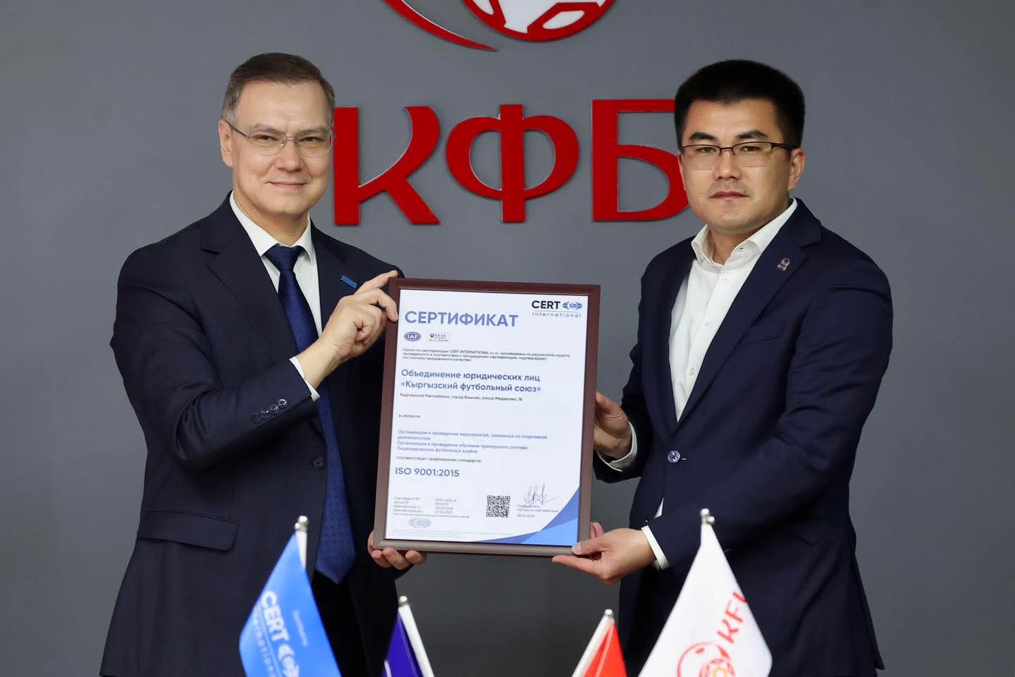 Кыргыз футбол биримдиги ISO 9001:2015 эл аралык стандартына шайкештикти далилдеген сертификатын алып, сапат менеджменти системасын эл аралык талаптарга ылайык ийгиликтүү киргизгенин тастыктагындыгын сыймыктануу менен кабарлайбыз.