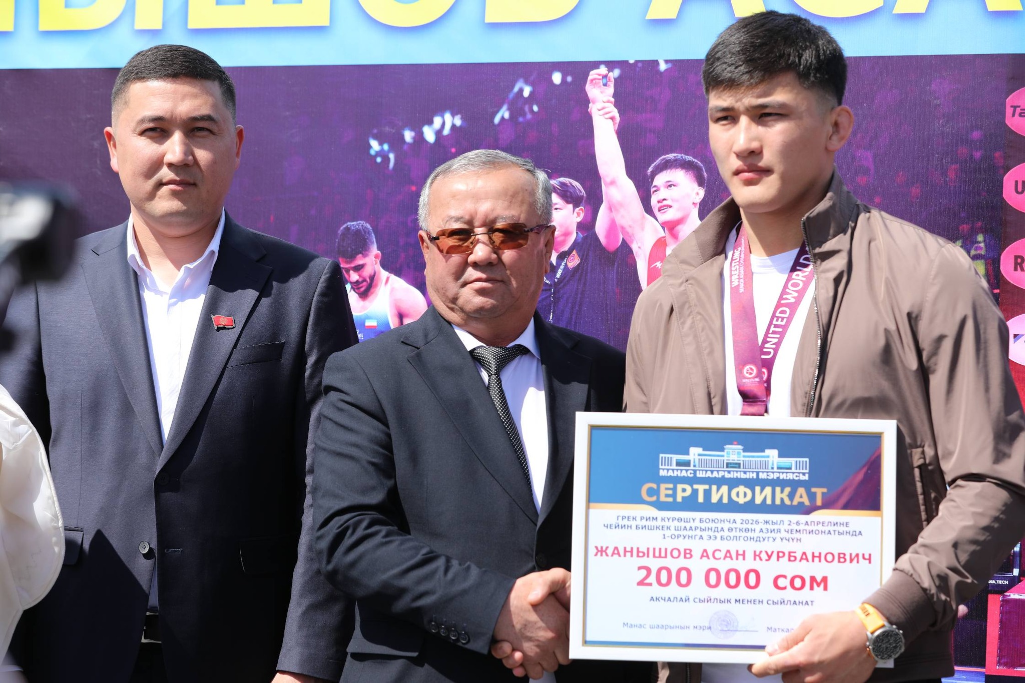 Иш-чаранын жүрүшүндө жергиликтүү бийлик тарабынан чемпион Асан Жанышовго 200 миң сом, ал эми анын машыктыруучусуна 60 миң сом өлчөмүндө акчалай сыйлыктын сертификаттары салтанаттуу түрдө тапшырылды.