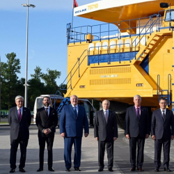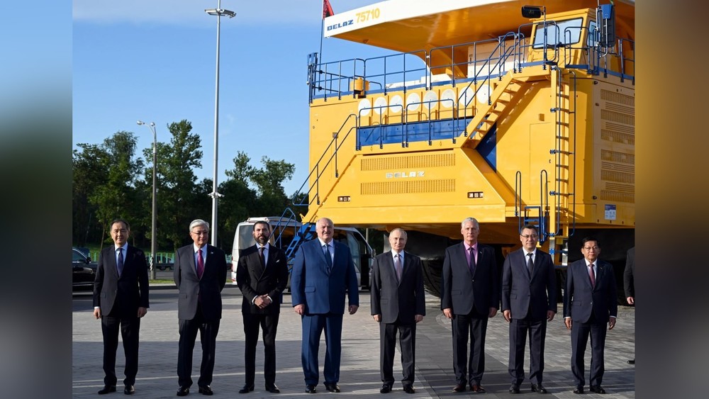 Жогорку Евразия экономикалык кеңешинин кезектеги жыйынына катышуучу-өлкө лидерлери жүк көтөрүмдүүлүгү 450 тонна болгон жүгүн автоматтык түрдө түшүрүүчү БелАЗ-75710 карьердик унаасынын фонунда биргелешип сүрөткө түшүштү.