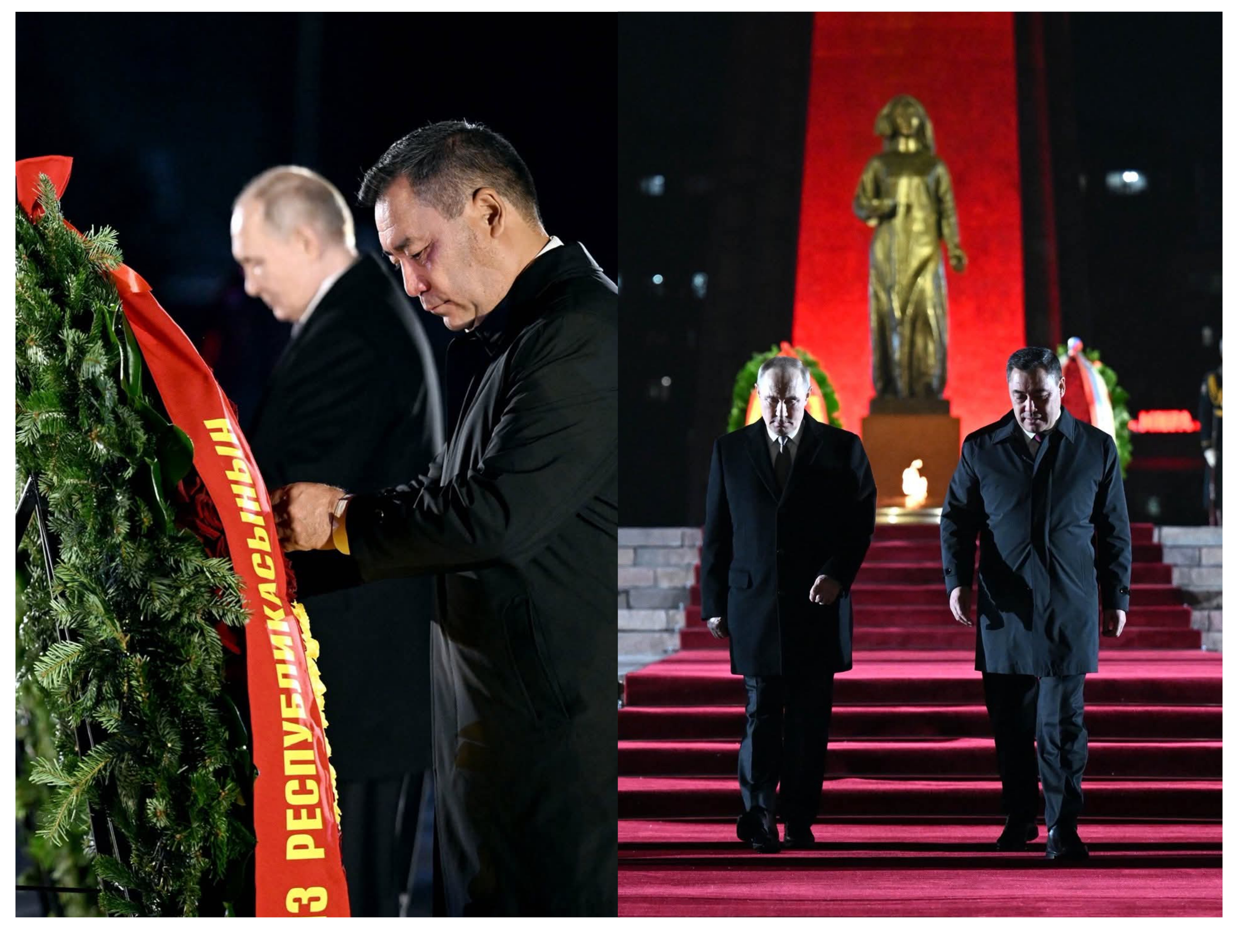 Кыргызстандын президенти Садыр Жапаров жана Россиянын президенти Владимир Путин бүгүн, 25-ноябрда Россия лидеринин Кыргызстанга болгон мамлекеттик сапарынын алкагында Бишкек шаарында Жеңиш аянтындагы Өчпөс отко гүлчамбар коюшту.