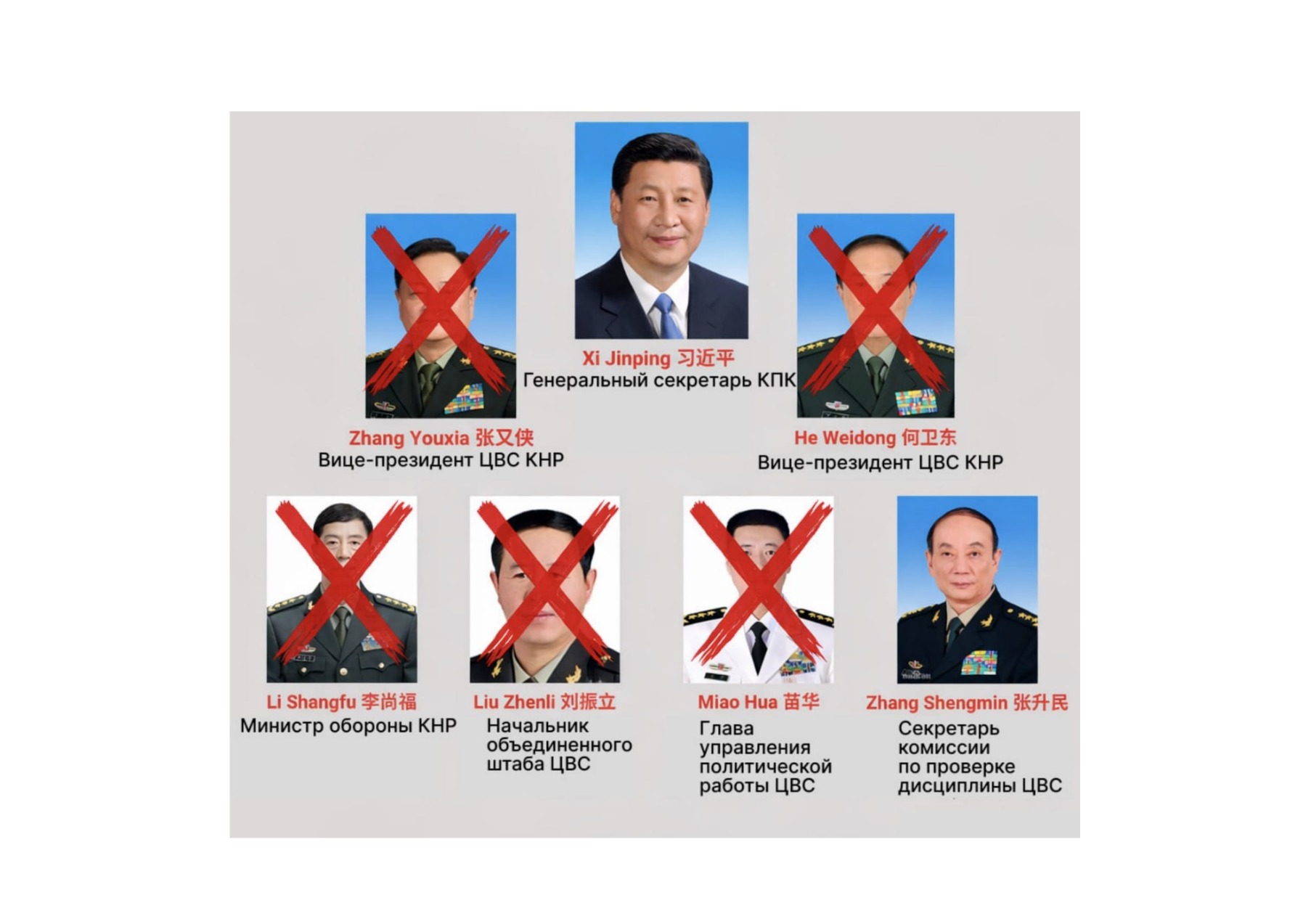 2023-2025-жылдар аралыгында Кытайдын коргоо министри Ли Шанфу, саясий башкармалыктын башчысы Мяо Хуа, БАКтын төрагасынын орун басары Хэ Вэйдун да камакка алынган.