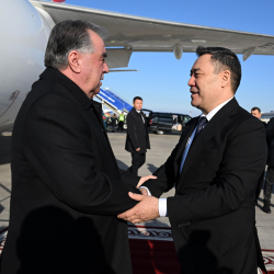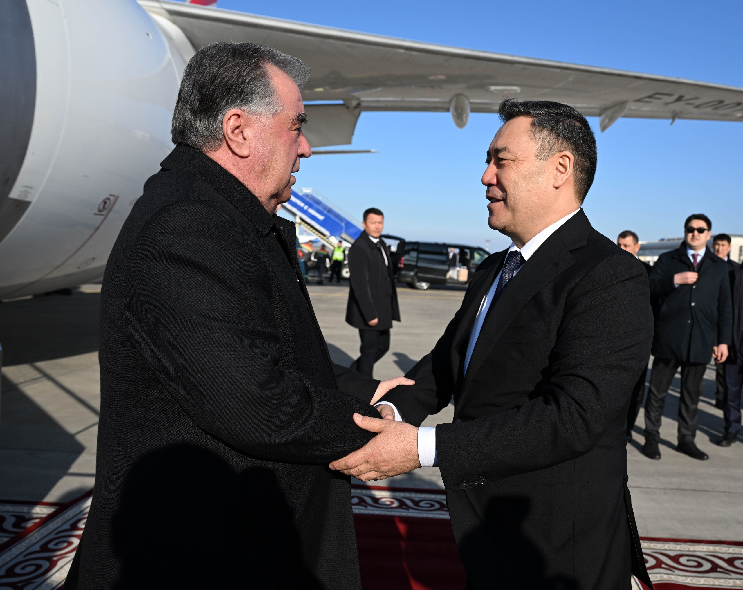 “Манас” эл аралык аэропортунда Тажикстандын президентин Кыргызстандын президенти Садыр Жапаров тосуп алды.