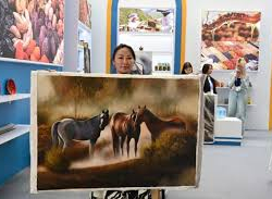 В национальном павильоне Кыргызстана Айгуль Усубалиева познакомила посетителей с произведениями масляной живописи с ахалтекинцами, шерстяными украшениями ручной работы и шелковыми платками с изысканными узорами.