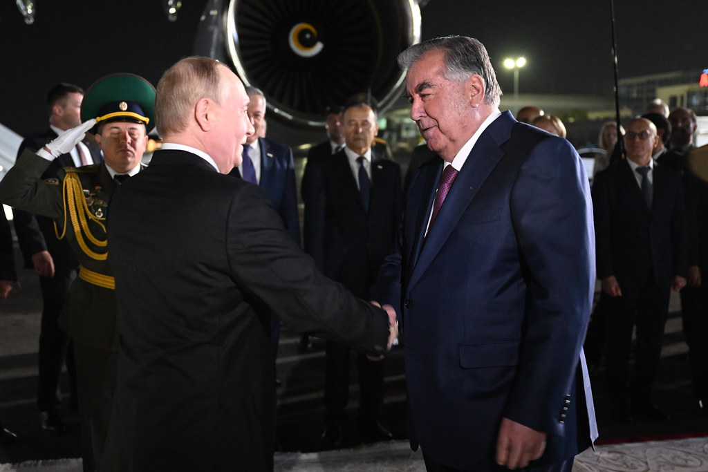 Президент Республики Таджикистан, Лидер нации уважаемый Эмомали Рахмон в знак высокого уважения тепло и искренне встретил высокопоставленного гостя - Президента Российской Федерации уважаемого Владимира Путина.