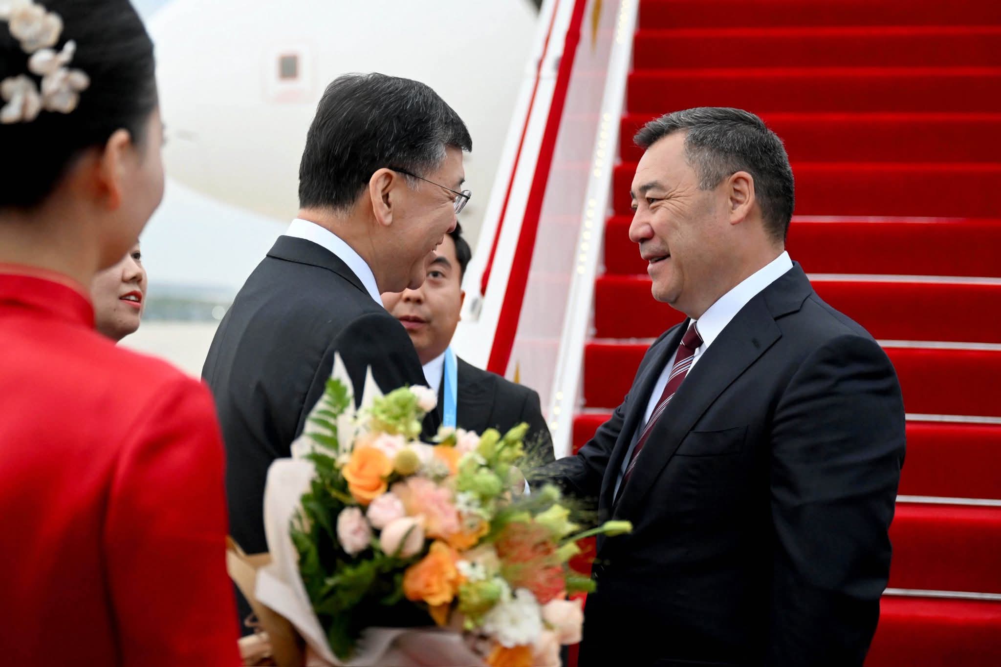 Президента Садыра Жапарова встретили Министр науки и техники Китайской Народной Республики Инь Хэчжун и другие официальные лица.