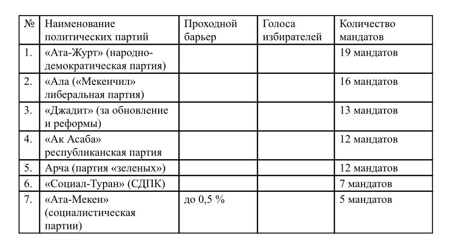 - принять конституционный Закон о парламенте, где вводится норма, согласно которой парламент Кыргызстана должен состоять из семи политических партий. Из них четыре партии должны представлять провластные политические партии, а три – оппозиционные. Все семь политических партий должны быть ретроспективно историческими. К примеру, «Алаш», «Социал-Туран» (СДПК), «Джадит» (исламская партия за обновление и реформы, вместо «Ыйман нуру»), «Ата-Мекен» (социалисты), «Ата-Журт» (народно-демократическая партия), «Ак Асаба» (республиканская партия);