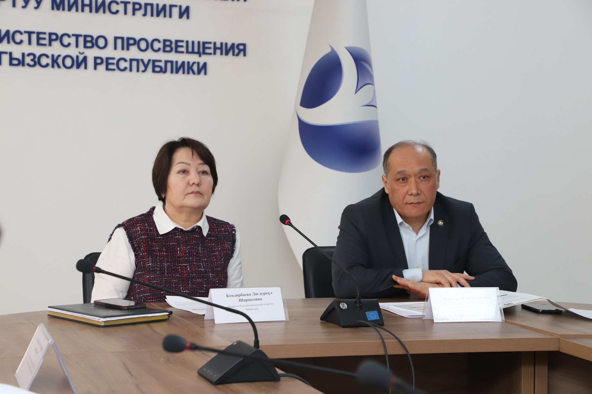 Сегодня, 26 января, в Министерстве просвещения Кыргызской Республики состоялось совещание, посвящённое вопросам использования государственного языка и реализации Закона Кыргызской Республики «О государственном языке Кыргызской Республики» в сфере образования. В мероприятии приняли участие министр просвещения Догдуркул Кендирбаева, председатель Национальной комиссии по государственному языку и языковой политике при Президенте Кыргызской Республики Мелис Мураталиев, а также руководители структурных подразделений.