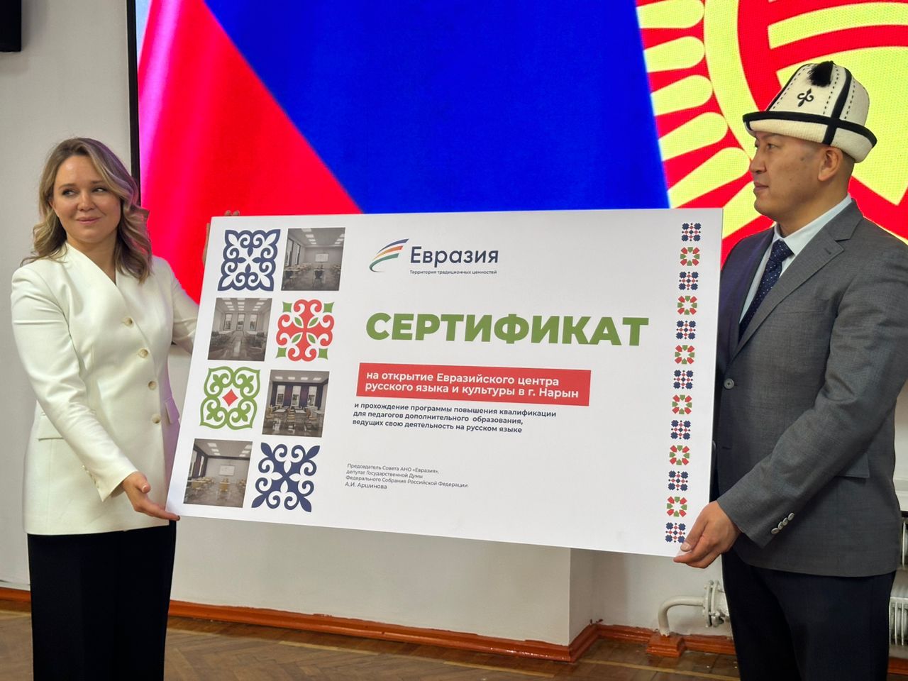 Сертификат на ремонт помещений, оснащение их современным оборудованием и мебелью, а также обучение педагогов Центра передан координатором образовательного проекта АНО «Евразия» Еленой Аверковой Полномочному представителю Президента в Нарынской области Эргешеву Алтынбеку Калдаровичу.