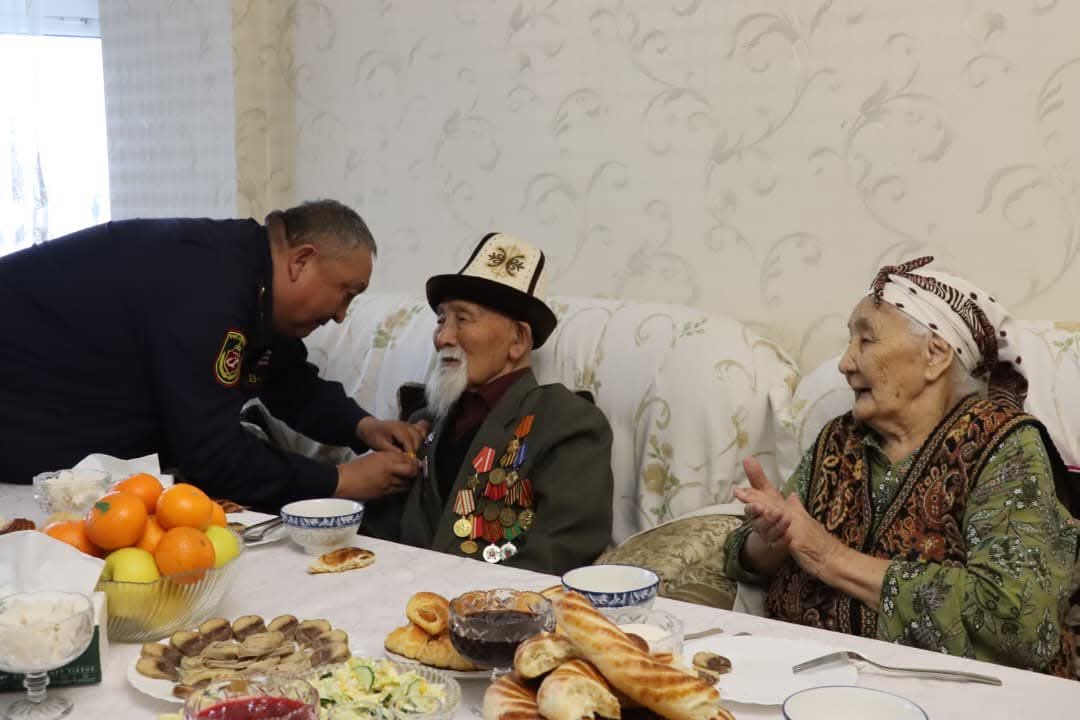 В честь Дня защитников Отечества личный состав Внутренних войск Министерства внутренних дел Кыргызской Республики и председатель Совета ветеранов поздравили ветерана Великой Отечественной войны Аспека Жумашева и вручили ему памятные подарки и награды.
