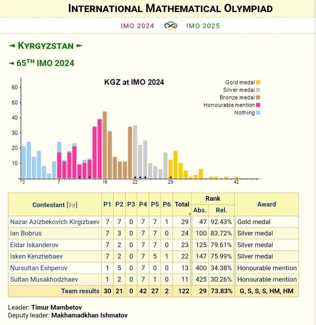 Кыргызстандын математика боюнча курама командасы 65-Эл аралык математикалык олимпиадада (International Mathematical Olympiad 2024 (IMO) биринчи жолу командалык эсепте 122 упай топтоп, 108 мамлекеттин ичинен 29-орунду ээледи.