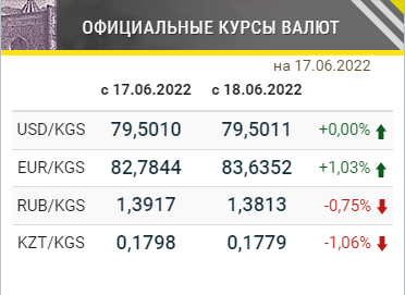 Кыргызстандын Улуттук банкы 18-июнга карата чет элдик валюталардын сомго карата расмий курстарын жарыялады. Такталган маалыматтарга караганда, сом еврого карата төмөндөп, рубль менен теңгеге карата бекемдеди.
