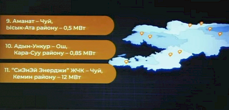 - "СиЭнЭй Энерджи" (Чүй облусунун Кеминский району – 12 МВт.