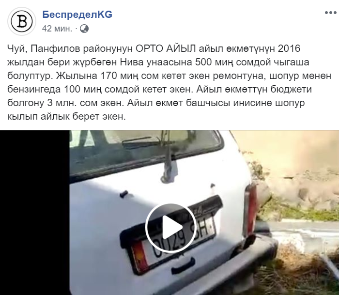 Чүй облусуна караштуу Панфилов районунун Орто айыл өкмөтүнүн жетекчилиги 2016-жылдан бери жүрбөгөн Нива унаасына 500 миң сомдой чыгаша кетиргени тууралуу видео Фейсбук баракчасына жарыяланды.
