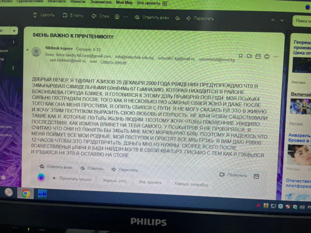 Муниципалитеттин маалыматы боюнча, мектептин электрондук дарегине окуу жайга мина коюлганы тууралуу кат келген.