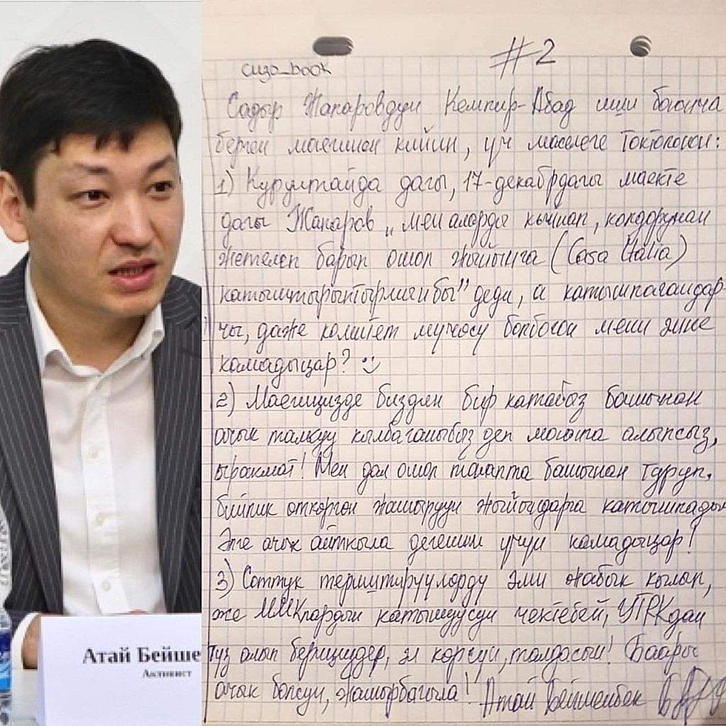 Кемпир-Абад маселеси боюнча камалып, абакта жаткан жарандык активист Атай Бейшенбек уулу президент Садыр Жапаровго Фейсбуктагы баракчасы аркылуу кайрылды.