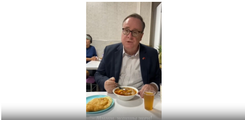 Ал Каракол базарындагы белгилүү мекемеге барып, жергиликтүү элдин атактуу даамын татып көрдү. "Абдан даамдуу (өтө даамдуу)!" – деди элчи даамын татып көрүп.