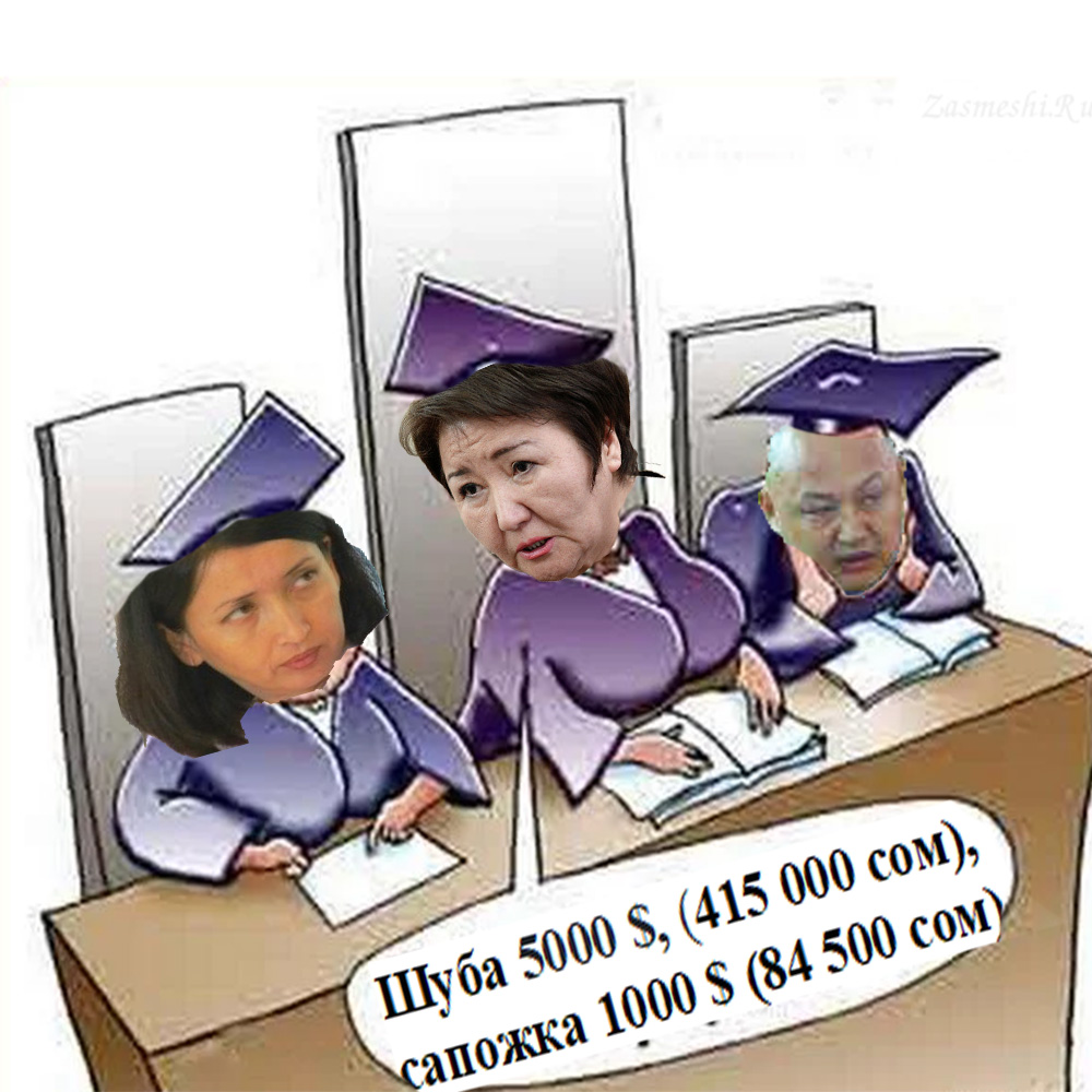 УКМК кылмыш ишин козгогондуктан Жогорку Соттун судьясы Дильфуза Боронбаева президенттин сунушу менен кызматынан убактылуу кетти. Анын ичип жегендери такталып жатат. УКМК төрагасы Камчыбек Ташиев соттордун айыбын ачып, 100 миң долларлык «жиптерде» жүрөрүн, хансарайларда жашай турганын айткан. Карапайым калк тишинин кирин соруп жашап жатканда бул көрүнүш кандай? УКМК тарап сотторду текшерип жатат. Эл тойсо да соттор тойбогон немелер экен, булар чалчаңдашып чет мамлекеттен эс алышат экен. Кечээ эле дагы бир сот үй-бүлөсүн алып Дубайга кетип калыптыр. Жакында кармалган соттун 20 батири бар экен. Бул эмне деген шумдук. Соттордун шубасы 5 миң доллар (415 000 сом), өтүгү миң доллар (84 500 сом) экен. А унаасы 100 миң доллар (8 млн 300 миң сом).
