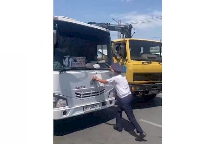Бишкекте Киев жана Бейшеналиева көчөлөрүнүн кесилишинен №41 автобустун айдоочусу милиционерди сүзүп кете жаздады. Бул тууралуу Милициянын кайгуул кызматынын басма сөз кызматы билдирди.