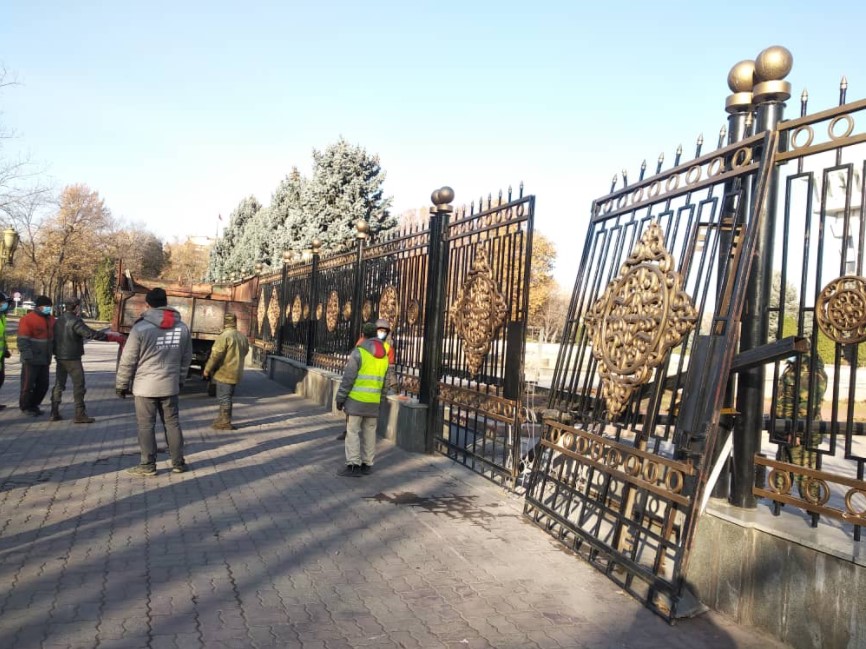 Бүгүн, 6-ноябрда Бишкекте Жогорку Кеңеш жана президенттин аппараты жайгашкан Ак үйдүн айланасындагы тосмону бузуу иштери башталды.