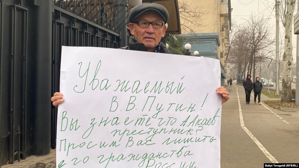Бүгүн 15-декабрда жарандык активист, укук коргоочу Өндүрүш Токтонасыров Кыргызстандын мурдагы президенти Аскар Акаевди кылмыш жоопкерчилигине тартууну талап кылып Орусиянын Кыргызстандагы элчилигинин астына пикетке чыкты.
