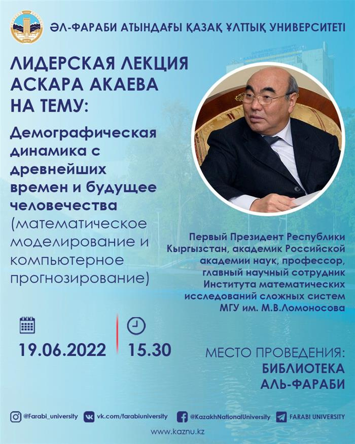 Эртең, 19-июнда Кыргызстандын туңгуч президенти Аскар Акаев Алматыга учуп барууну пландап жатат, анда ал Аль-Фараби казак улуттук университетинде “Байыркы мезгилден берки демографиялык динамика жана адамзаттын келечеги” деген темада лекция окуйт. Бул тууралуу аталган окуу жайдын сайтында маалымдалды.