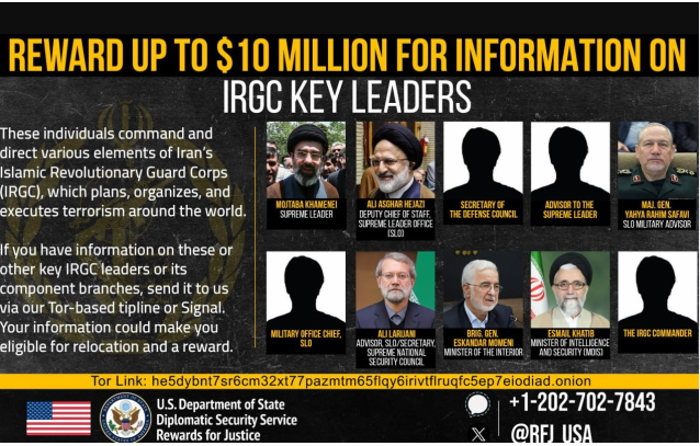 АКШ өкмөтү ирандык жогорку даражалуу лидерлер тууралуу маалымат бергендерге 10 миллион долларга чейин сыйлык сунуштай турганын жарыялады.