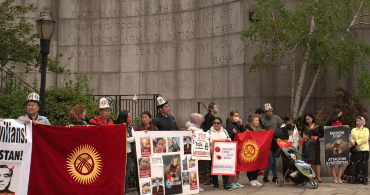 Кошмо Штаттарындагы кыргыз диаспорасы Бириккен Улуттар Уюмунун Нью Йорк шаарындагы башкы кеңсесинин алдына акцияга чыгышты.