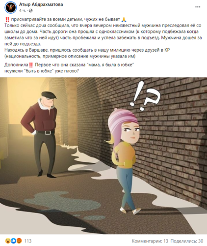 «Варшавада жүргөндүктөн достор аркылуу милицияга болгон окуяны билдирүүгө туура келди. Улуту, болжолдуу сүрөттөлүшү көрсөтүлгөн. Кызымдын мага биринчи айткан сөзү: «Апа, мен юбка кийип жүргөн элем», болду. Юбка кийүү чындап эле жаманбы? — деп жазган акыйкатчы.