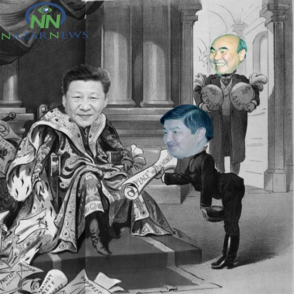 Каржы министри болуп туруп Кытайдан насыя алгандын башында турган ЖК депутаты Акылбек Жапаров Сооронбай Жээнбеков Бээжинге иш сапары менен барганда шалпаңдап кошо ээрчип алат. Кытайдын мамлекет башчысы Си Цзиньпин кыргыз делегациясы менен таанышып келатып, Акылбек Жапаровдун жанына келгенде тып токтойт.