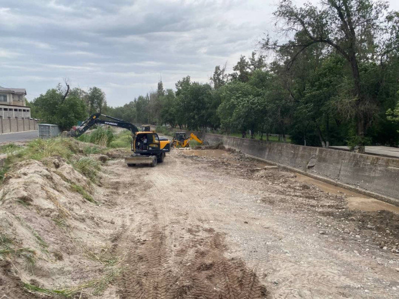 Дарыянын жээгинде куурап калган бадалдарды жана бак-дарактарды кыюу, камыштарды жана башка отоо чөптөрдү чабуу иштери аткарылууда.