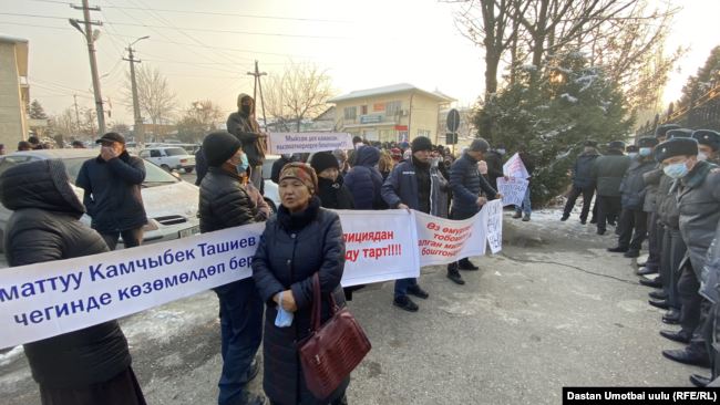 Ош шаарындагы Улуттук коопсуздук боюнча мамлекеттик комитетинин имаратынын алдында жүзгө жакын адам, буга чейин кармалган алты милиция кызматкерин бошотууну талап кылып чыгышты.