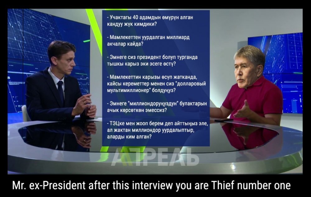 Албетте, журналист же кандай гана ММК булагы болбосун президенттен интервью алгысы келет. Андан эч ким кынтык издегиси келбейт. Бирок, “Апрель тв” телеканалы президент С. Жээнбековдон интервью алаардан мурун өздөрүнүн кожоюну, экс-президент А. Атамбаевден интервью алып коюшса жакшы болмок. Себеби, бүгүнкү күндө коомчулук тарабынан экс-президентке жолдоно турган суроолор өтө арбын болуп турат. Мына ошол суроолорго жооп кандай боло турганы өтө кызык. Мисалы, төмөндөгүдөй суроолор:
