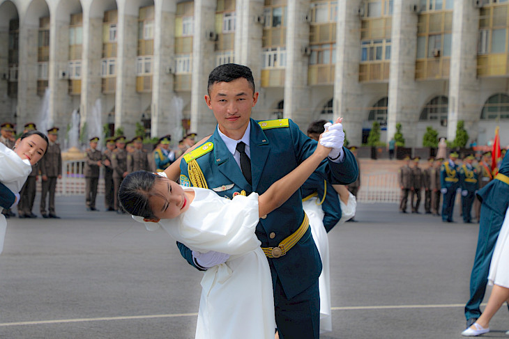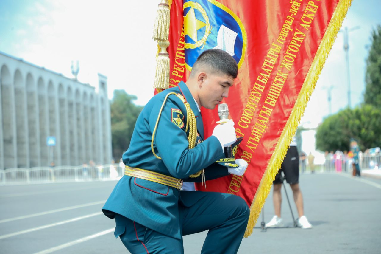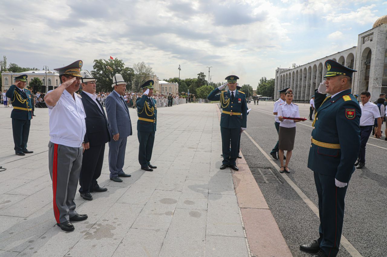 Бүтүрүүчүлѳр оркестр маршынын коштоосунда окуу жайдын күжүрмѳн туусунун чыгарылышын салтанаттуу тосуп алышты. 80ге жакын бүтүрүүчүлөрдүн курсанттык погондору жаркыраган лейтенанттын жылдыздары менен алмаштырылды, аларга жогорку билими тууралуу дипломдор аскер жетекчилери тарабынан тапшырылды.