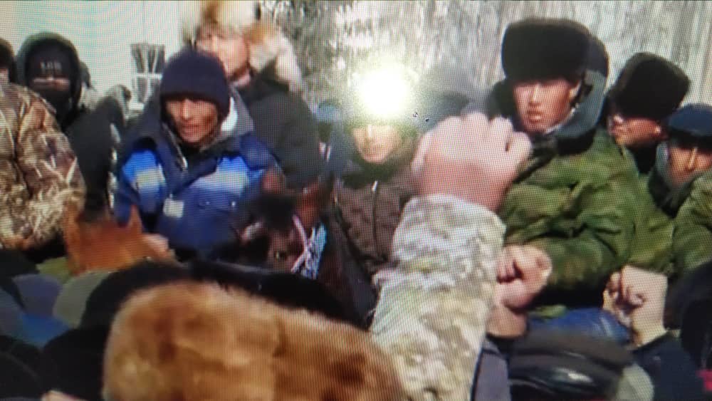 Аталган жыйынга келгендер Ат-Башыдагы логистикалык борбордун курулушуна толугу менен каршы экендигин айтып, айрым учурда чектен чыгып кетүүдө. Атчандар митингдин катышуучуларынын үстүнө ат бастырып киришти. Кыйкырык, ызы-чуу болууда. Бири-бирин укпай жатышат.