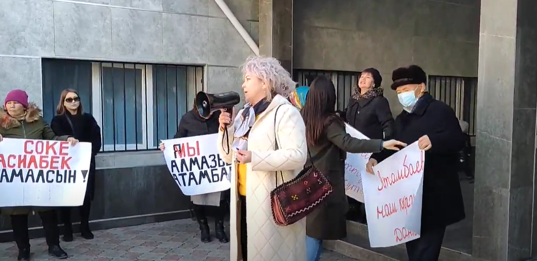 Бишкектин Биринчи Май райондук сотунун имаратынын алдында экс-президент Алмазбек Атамбаевди колдоо митинги өтүп жатат.