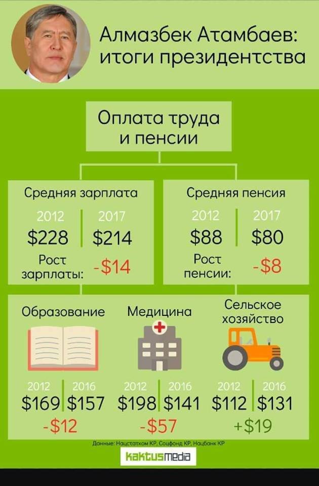 Атамбаевдин бул айткандарын “Кактус.Медиа” ресурсу даярдаган төмөнкү статистика жокко чыгарып турат. Анда Алмазбек Атамбаевдин президенттиги тушунда Кыргызстанда эмгек акы менен пенсиянын, билим берүү менен медицина тармагына салынган каражаттын көлөмүнүн азайганы көрүнүп турат. Маалыматтар расмий булактардан чогултулган.