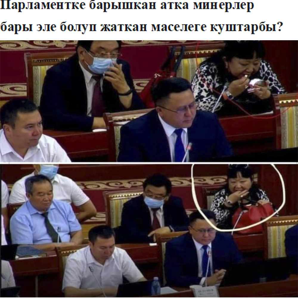 Өздөрүн –өздөрү алып жүрүүнүн этикасын билбеген атка минерлер парламентте отурушса да күнүмдүк өз иштерин бүтүрүшүп, курут жеп, ооздоруна конфет тыгышып, жалжаңдаша беришет. Бул Кыргызстан үчүн “нормально” көрүнүш сыяктуу болуп баратат. Бул коллаж эмес, кадимки эле операторлор тартып алышкан атка минерлердин сүрөтү. Ошол жерде отурган сулуу кыз өз билгенин кылып жатат. Бул эми бизде болуп жаткан күнүмдүк окуя. Ал эми Швецияда болсо депутаттар мугалимдер менен теңмсе-тең айлык алышат. Депутаттарды айлыгы жок иштеп көрсүнчү, Швецияда депутаттардын айлыгы мугалимдердики менен бирдей, мурун айлыгы жок эле иштөөчү экен.