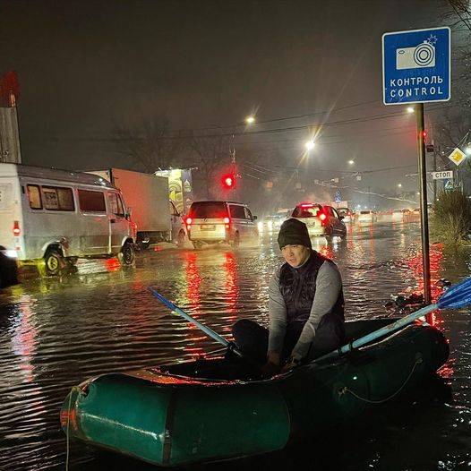 Буга чейин Бишкекте жаандан улам жаралган көлчүктө активист кайык менен жүргөндүгү жазылган.