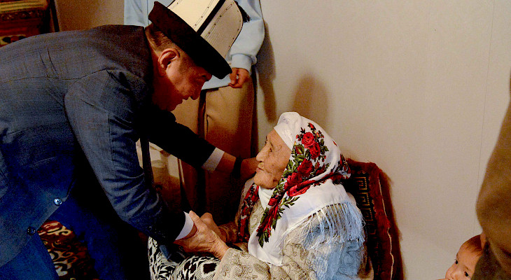 Министрлер кабинетинин жетекчиси Акылбек Жапаров Баткен районунун Рават айылынын 102 жаштагы тургуну Асал Абдимутовага барып, карылар күнү менен куттуктады.