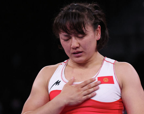 Кыргызстандык балбан Мээрим Жуманазарова коло байге үчүн казакстандык Елена Шалыгина менен күрөшүп жатып, жаракат алгандыгына байланыштуу беттеш токтотулду.