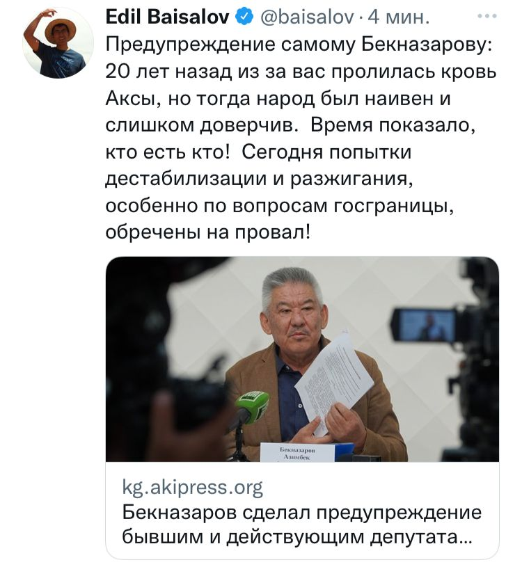 «Бекназаровдун өзүнө эскертүү: 20 жыл мурун Аксыдагы кан сиздин айыңыздан төгүлгөн, бирок ошондо эл өтө эле ишенчээк болгон. Кимдин ким экенин убакыт көрсөттү! Бүгүнкү күндө, өзгөчө мамлекеттик чек ара маселелери боюнча туруксуздукка жана курчутууга жасалган аракеттер ийгиликсиздикке байланган», — деп жазган Байсалов.